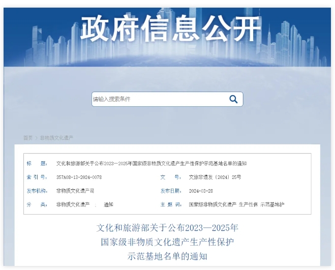 文化和旅游部关于公布2023—2025年国家级非物质文化遗产生产性保护示范基地名单的通知